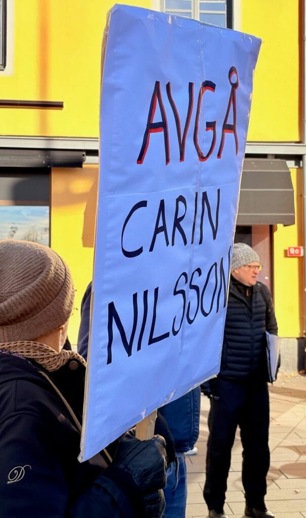 Det som drog ned mest applåder var kravet på att äldrenämndens ordförande Carin Nilsson (S) bör avgå. Detta togs upp av flera talare. Den kvinna som höll i ett plakat med texten ”Avgå Carin Nilsson!” fick också en rad positiva tillrop av förbipasserande i samband med manifestationen.