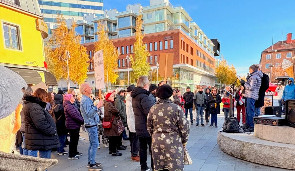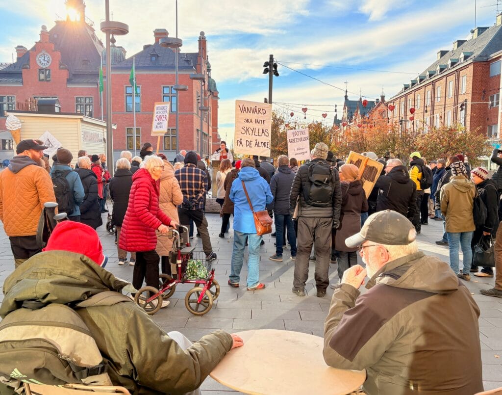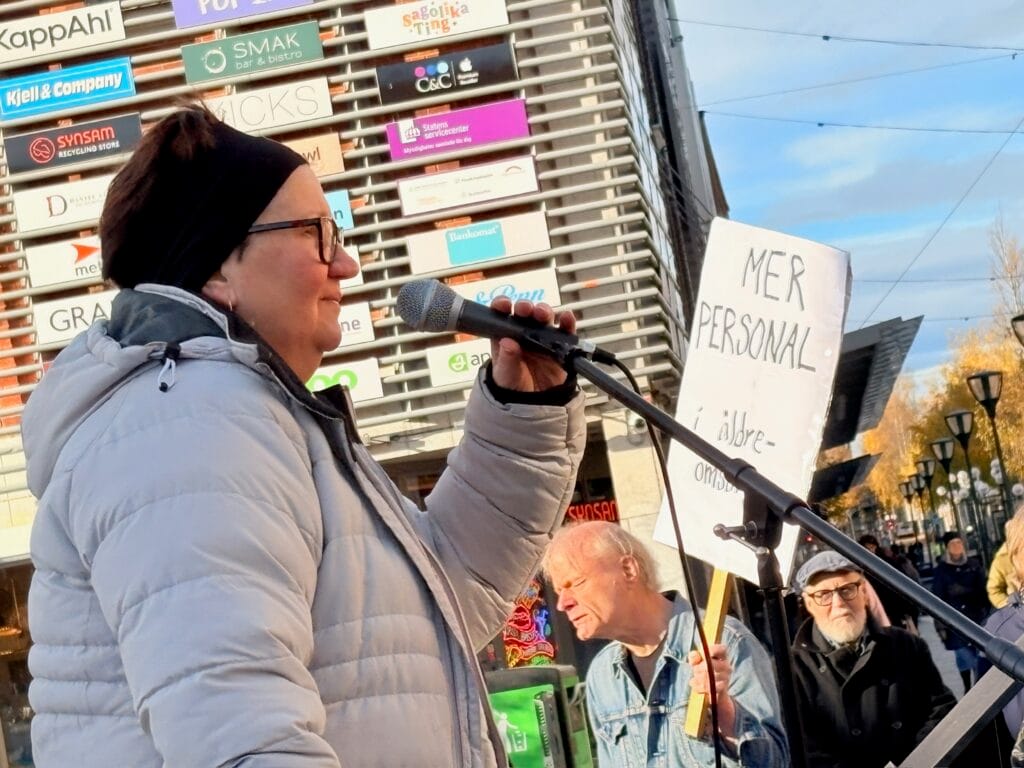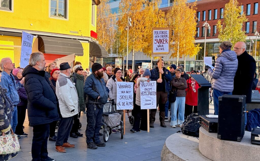 Lördagen den 18 oktober genomfördes en manifestation till försvar av äldreomsorgen på Rådhustorget i Umeå. Under den knappa timme som manifestationen höll på deltog totalt ca 100 personer. Som mest stod 70 personer framför talarstolen och lyssnade och de som promenerade längs gågatan fick tränga sig förbi folksamlingen.